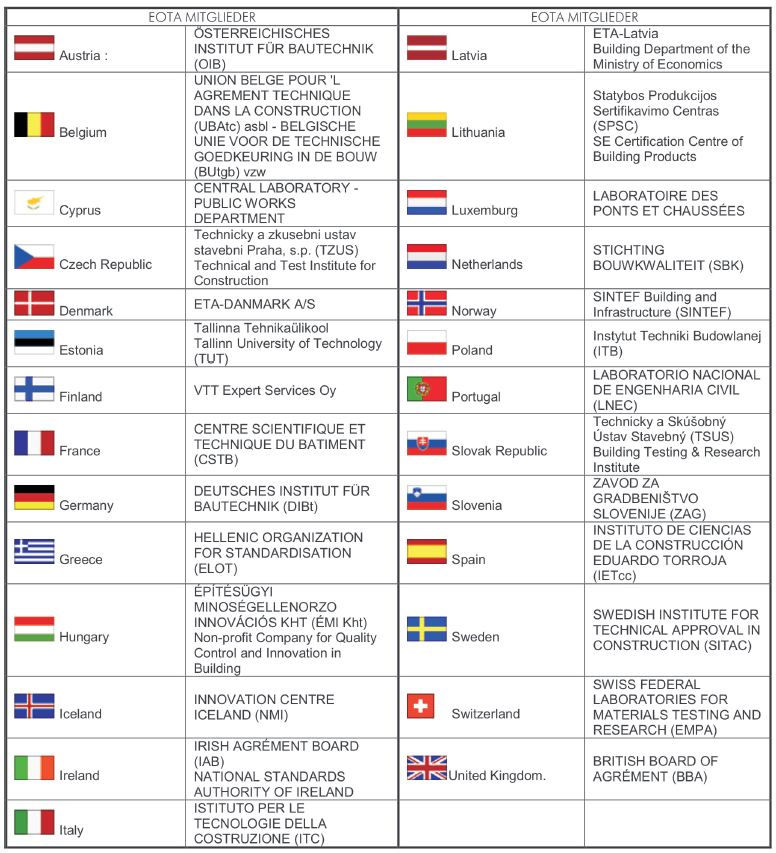 Alle hier aufgeführten nationalen Zulassungsstellen sind Mitglied der EOTA.