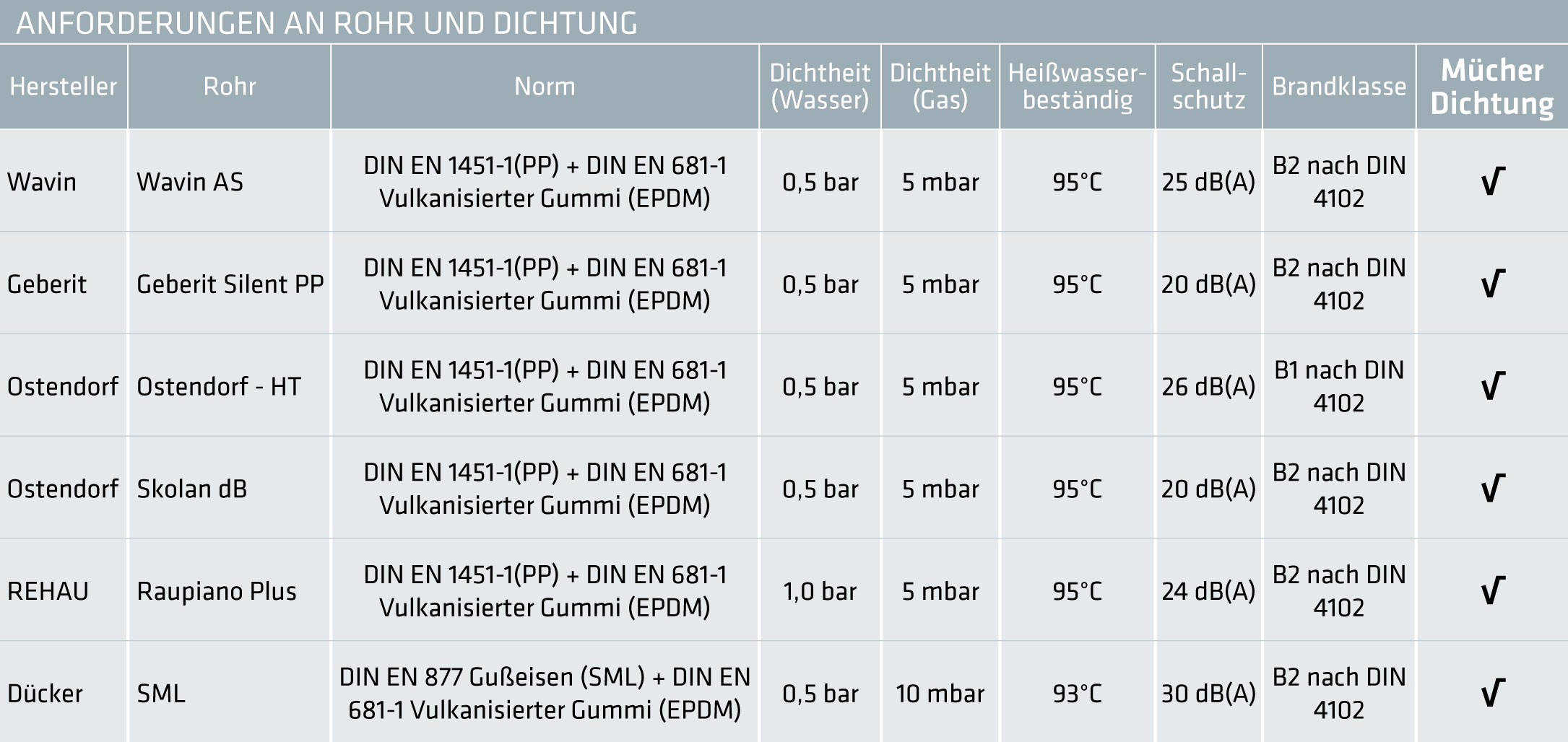 Die Gummi- und Kombiadapter von MÜCHER erfüllen die in der folgenden Tabelle aufgeführten Leistungsanforderungen einiger exemplarisch aufgeführten Rohrhersteller: